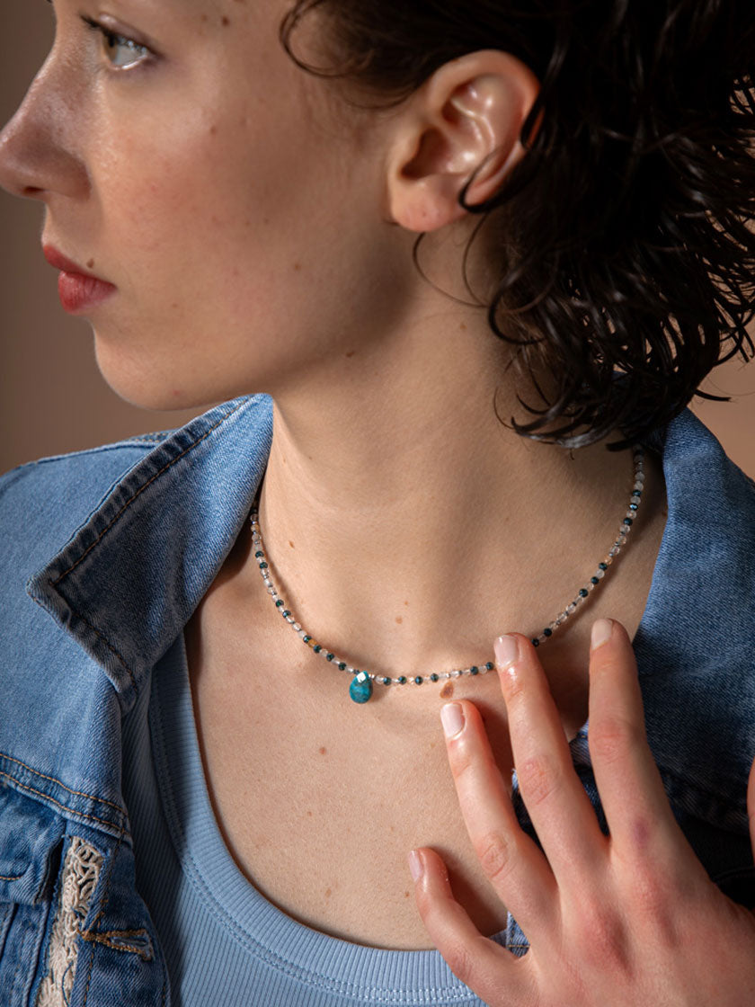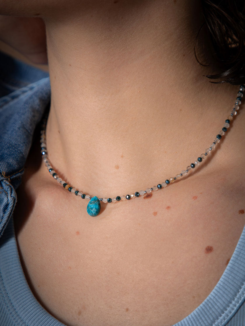 Deine handgefertigte Halskette «Azur» kombiniert die beruhigende Energie von Citrin und Apatit mit der erdenden Kraft des Hämatits – ein kraftvolles Trio für Balance und innere Klarheit.