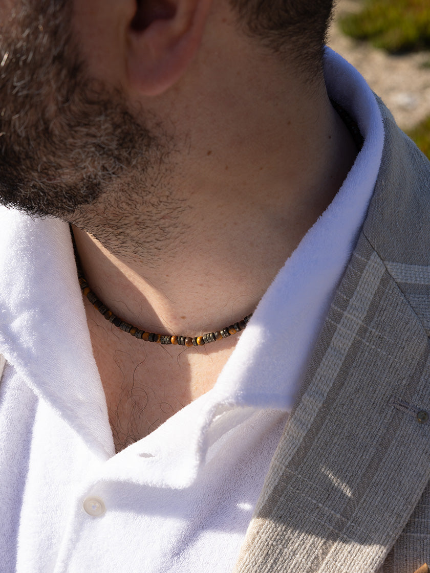 Collier «Levy Œil-de-tigre» de CORAZON Collier aux nombreux détails raffinés – Fabriqué à la main dans l'atelier Corazón à Sutz. Le collier «Levy» est disponible en plusieurs couleurs.