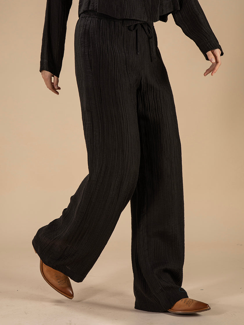 Die Hose «Najupi» von SYNDICATE besticht durch ihre weite, leichte Silhouette. Komfortabel geschnitten und hochwertig verarbeitet, unterstützt sie deinen natürlichen Bewegungsfluss. Ein Essential für entspannte Eleganz, das dich durch den Tag begleitet.