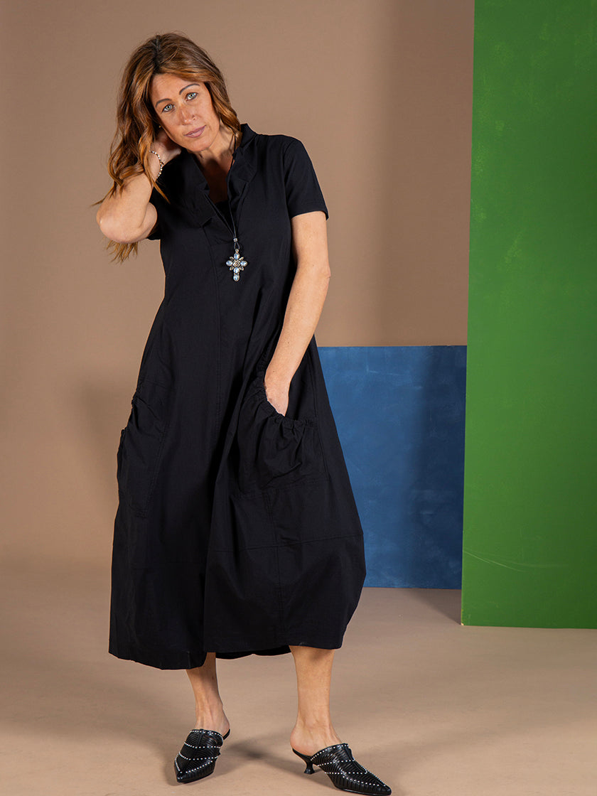Cette robe allie une élégance minimaliste à des détails architecturaux, ducol extravagantauxpoches caractéristiques qui apportent le volume nécessaire.