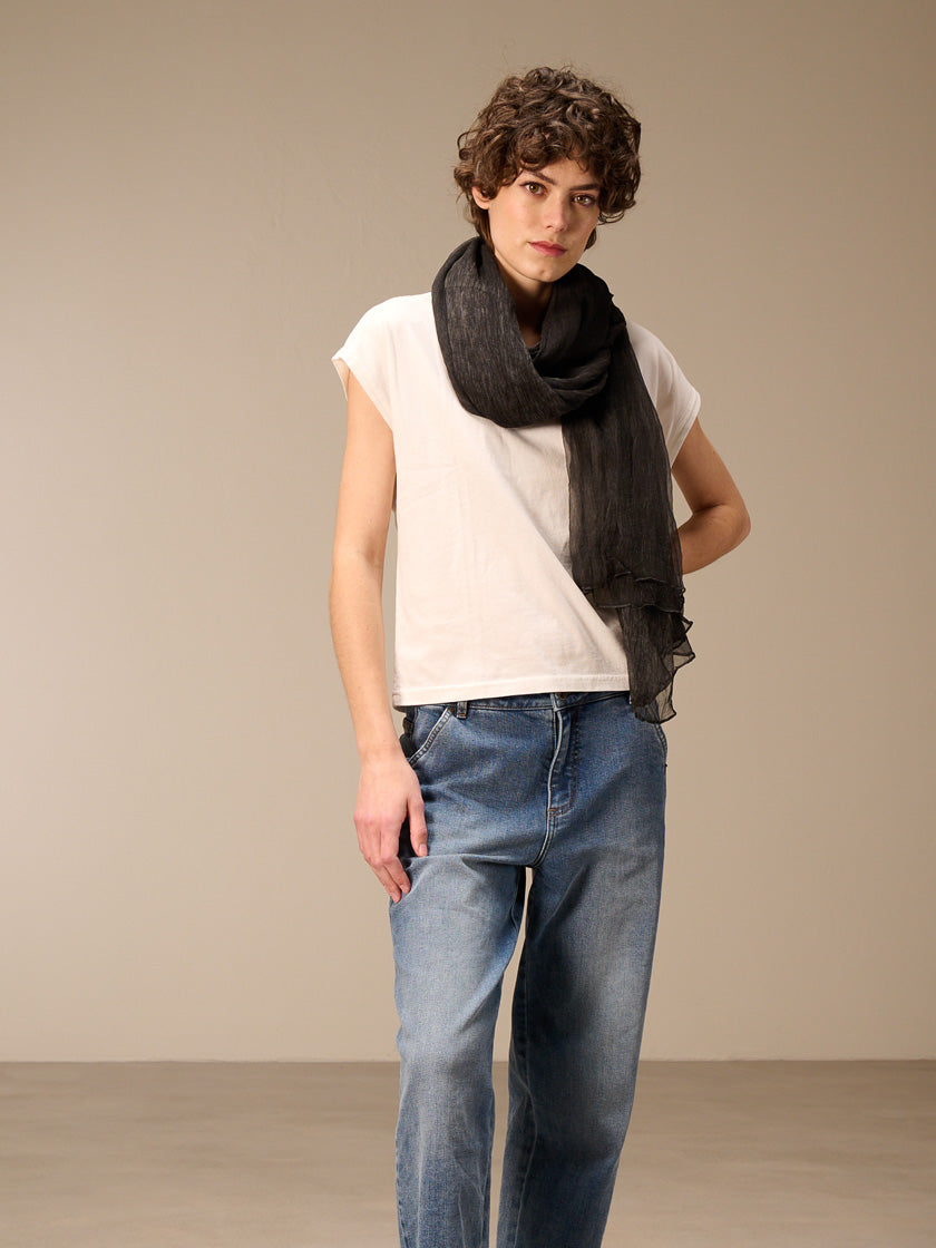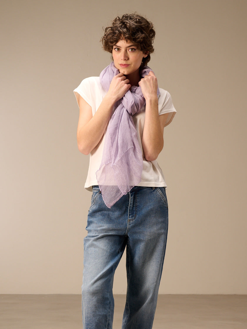 Laver avec des couleurs similaires dans un filet à linge et avec une lessive pour soie. Sans adoucissant. Les irrégularités de couleur sont voulues et rendent chaque pièce unique. L'effet délavé est renforcé et peut déteindre sur les vêtements et les surfaces.