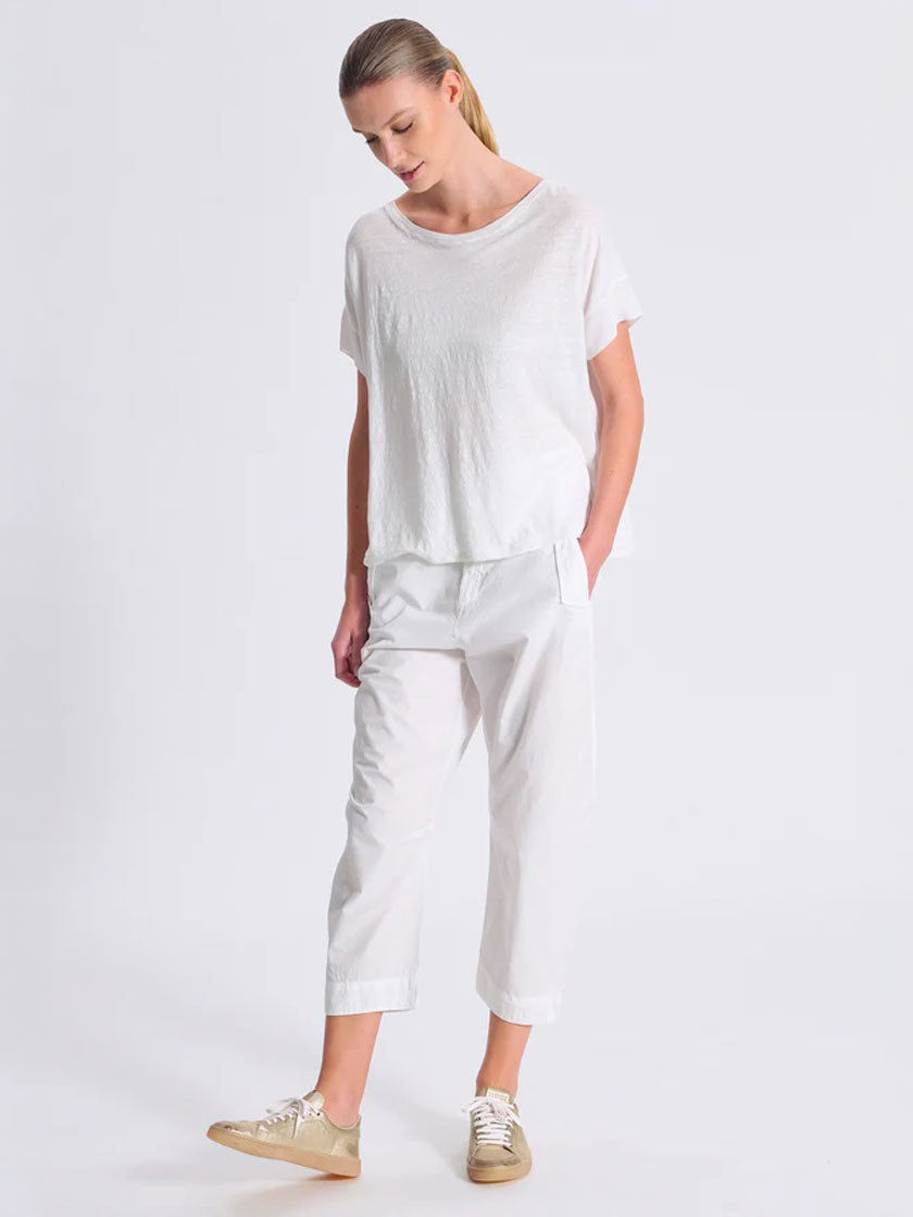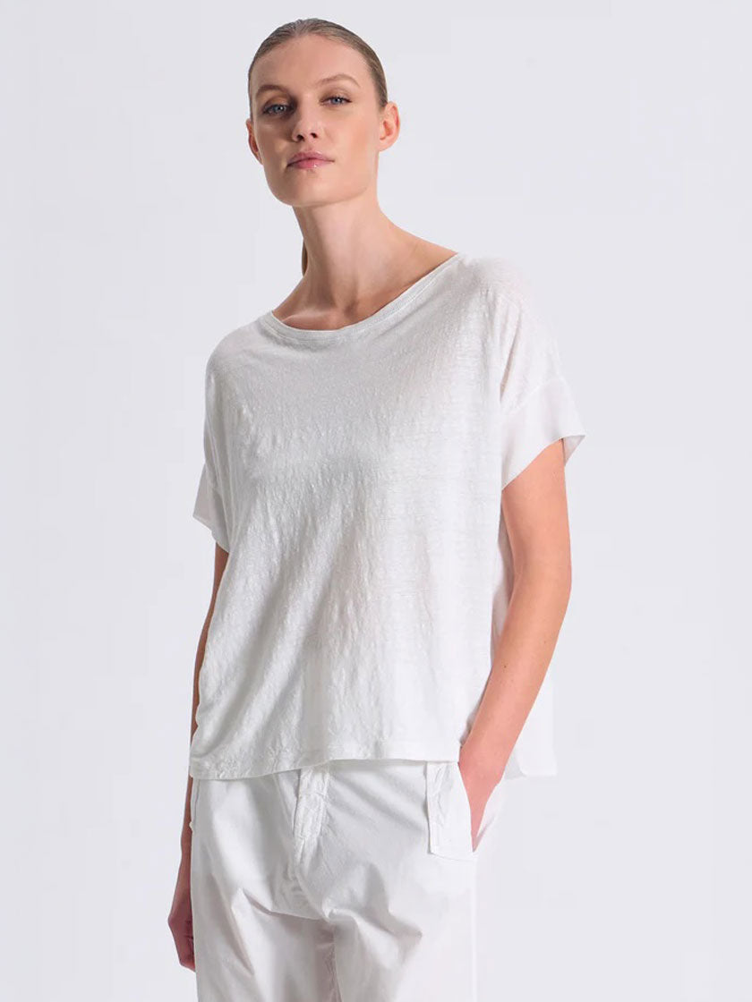 T-shirt oversize décontracté à encolure ronde classique. Le devant se distingue par un jersey de lin doux, tandis que les manches et le dos sont confectionnés en georgette de viscose fluide – une combinaison de matières raffinée pour un confort optimal. Teint à la pièce pour des variations de couleur uniques.