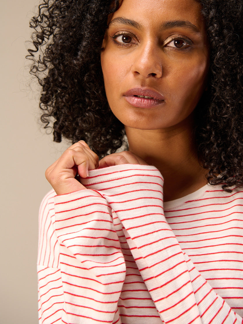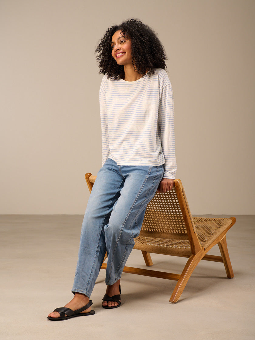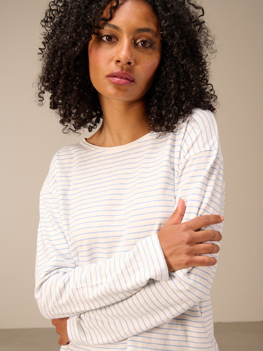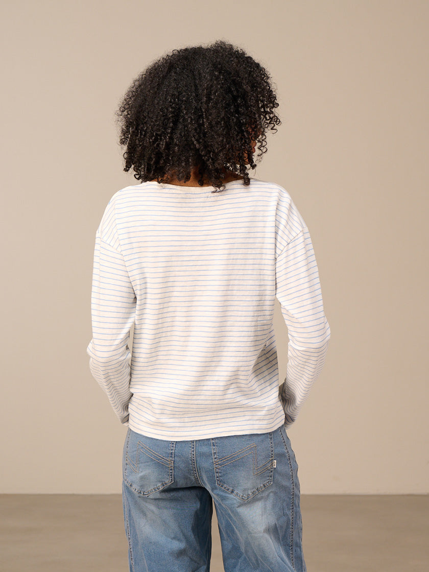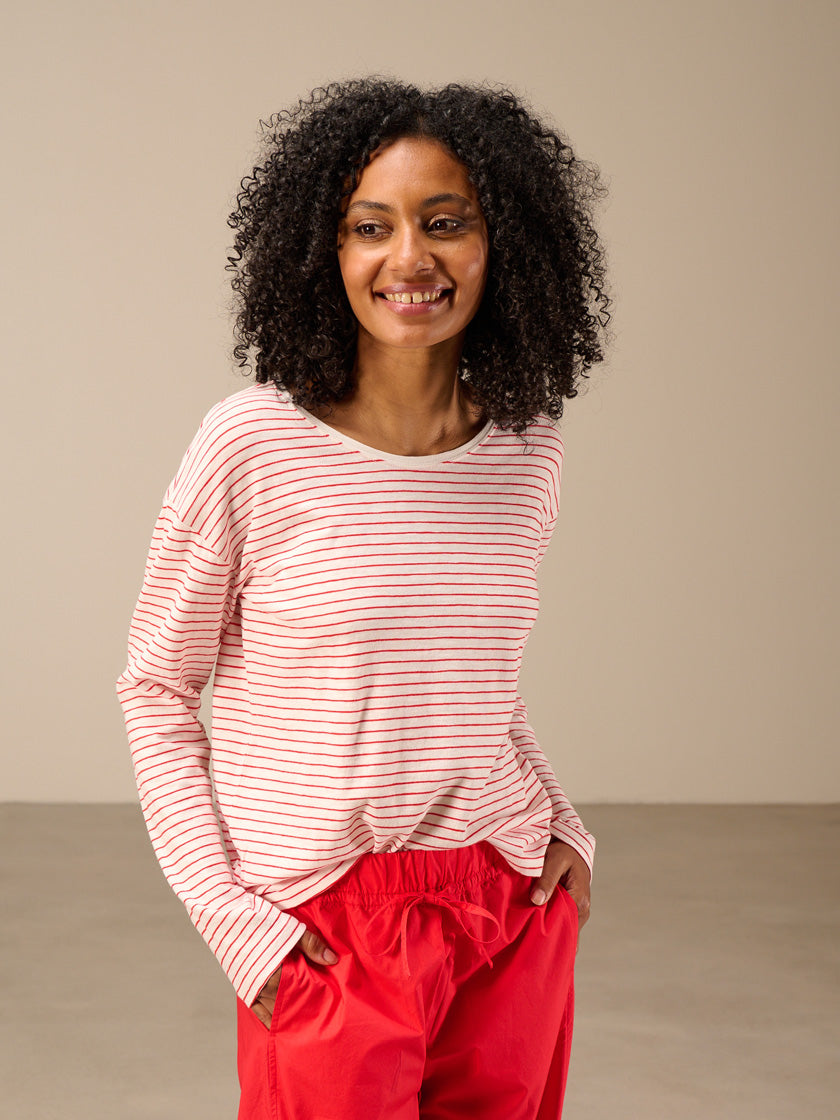 T-shirt à manches longues rayé de NILE coton biologique certifié. Cette matière de grande qualité séduit par sa douceur et sa durabilité. Son motif rayé intemporel s'accorde avec de nombreuses tenues et fait de ce t-shirt un basique polyvalent indispensable à toute garde-robe. Certifié GOTS pour une culture durable et une production équitable. Parfait pour le quotidien : confortable, résistant et respectueux de l'environnement.