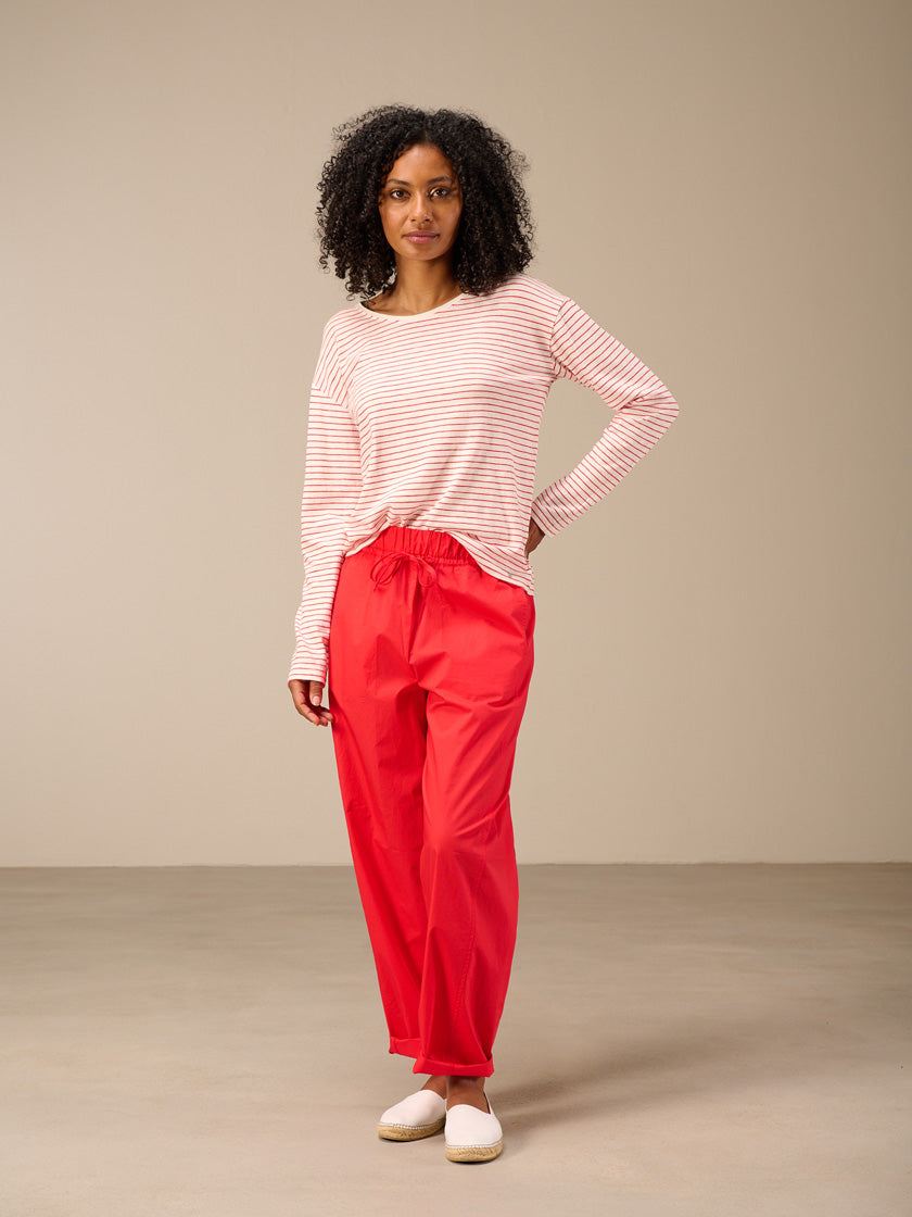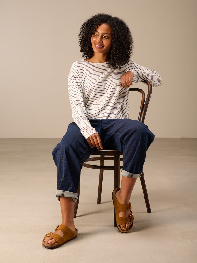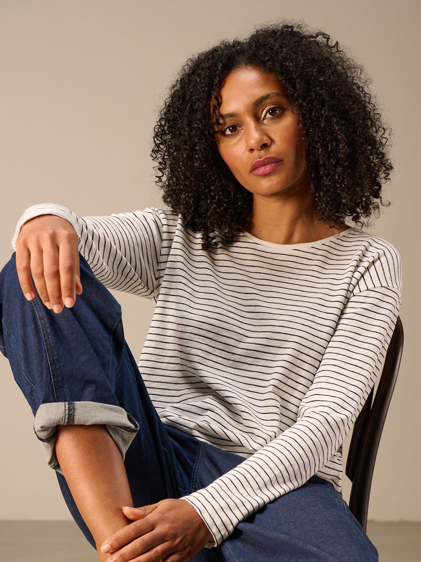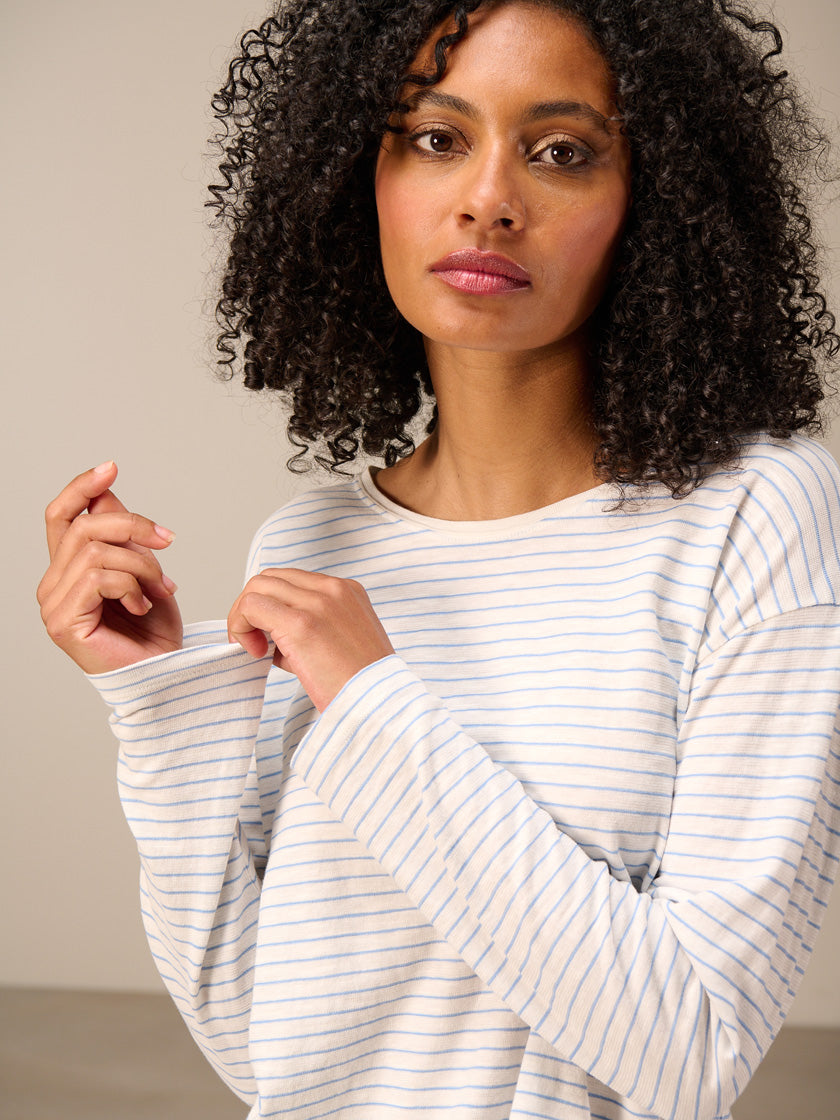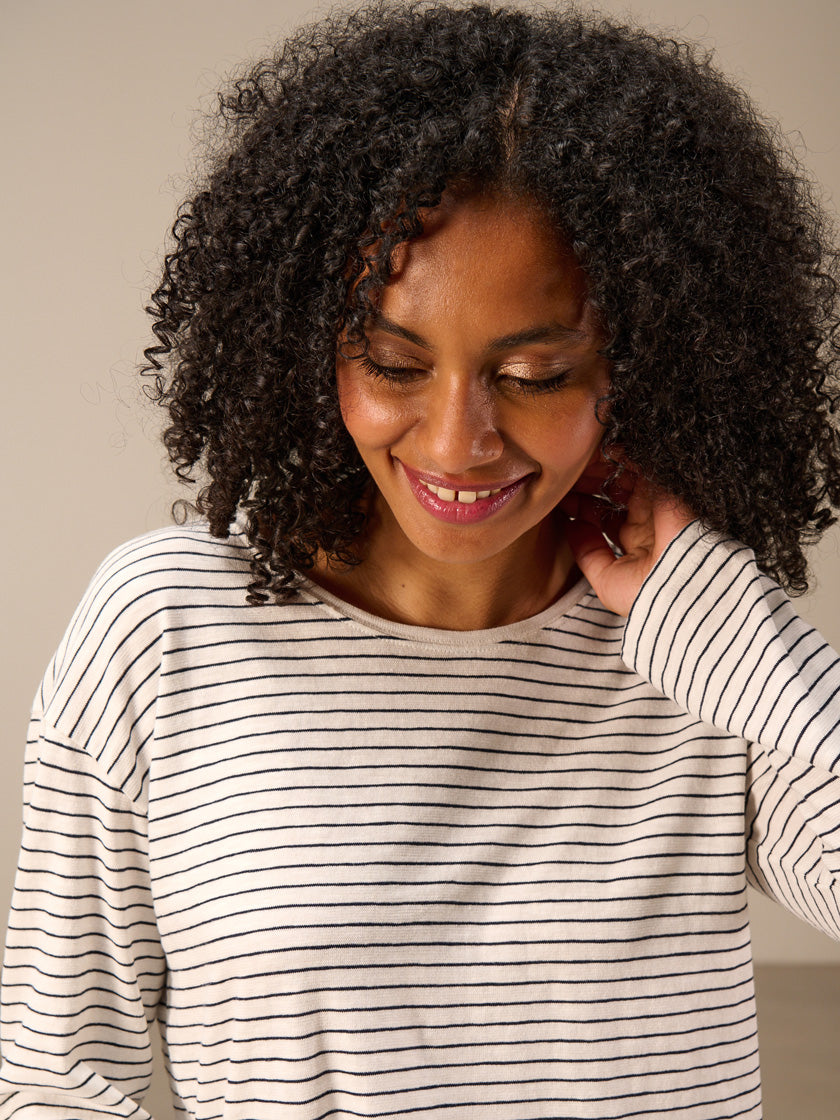 T-shirt à manches longues rayé de NILE coton biologique certifié. Cette matière de grande qualité séduit par sa douceur et sa durabilité. Son motif rayé intemporel s'accorde avec de nombreuses tenues et fait de ce t-shirt un basique polyvalent indispensable à toute garde-robe. Certifié GOTS pour une culture durable et une production équitable. Parfait pour le quotidien : confortable, résistant et respectueux de l'environnement.